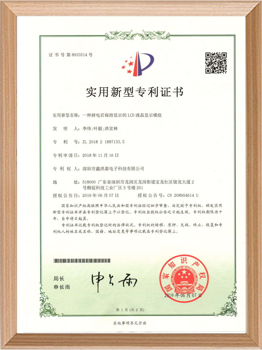 實(shí)用新型專(zhuān)利證書(shū)