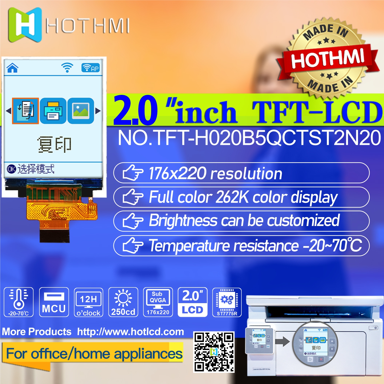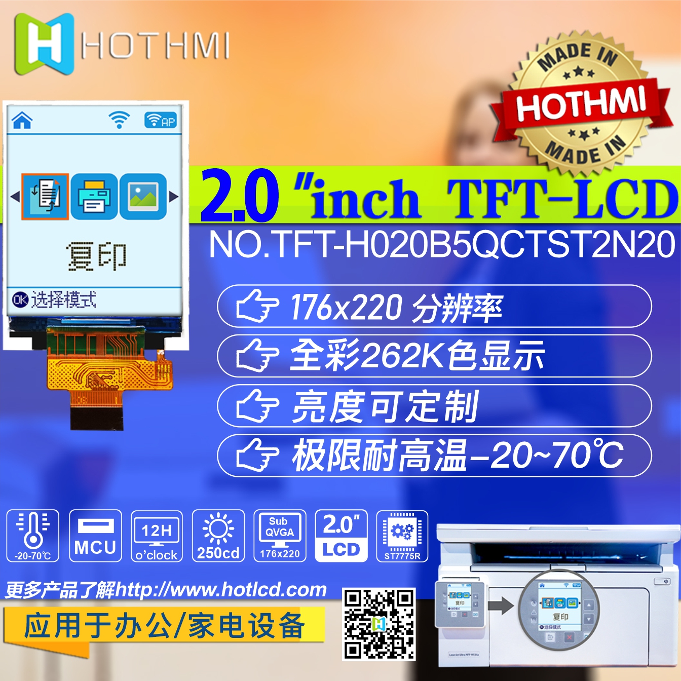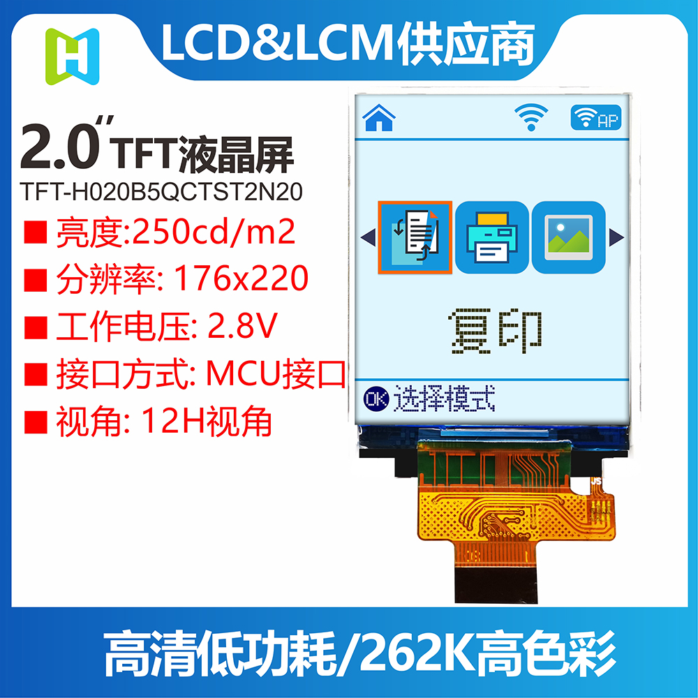 TFT-H020B5QCTST2N20 是鑫洪泰HOTLCD研發(fā)團隊精心設計的一款2.0寸豎屏TFT彩色液晶顯示屏,176*220分辨率,12H視角,65K/262K真彩色,內置ST7775R控制器,支持MCU 8bit接口,20PIN插接式FPC即可連接主板(可選配連接器),單電源DC3.2V供電.此款TFT模塊可選配觸摸屏,所有材料均符合環(huán)保要求RoHS標準,廣泛應用于各式儀器儀表、智能設備、分析儀器、手持式儀器、行車(chē)紀錄儀等, 適用于多種單片機開(kāi)發(fā)平臺,如:8051、PIC、AVR、ARDUINO、ARM和樹(shù)莓派Raspberry Pi等。