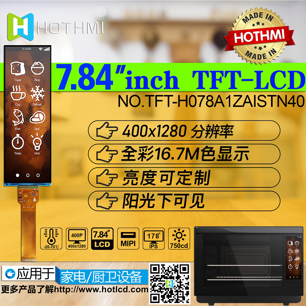 TFT- H078A1ZAISTN40是一款7.84寸采用IPS面板技術(shù)的TFT液晶顯示器模塊。此款TFT-LCD分辨率400 x 1280 pixels。TFT- H078A1ZAISTN40模塊內置ST7703 driver IC,支持MIPI接口,對比度700 (典型值),模塊亮度為700 nits(典型值)。H078A1采用IPS面板技術(shù),視角比TN玻璃更廣范圍為左: 80 / 右: 80 / 上: 80 / 下: 80 度,色彩鮮明,具有飽和自然的優(yōu)質(zhì)畫(huà)面。H078A1模塊的驅動(dòng)電壓為3.3V,平常黑/透射式LCD,霧面玻璃,屏幕長(cháng)寬比3:1。。此款模塊的工作溫度是-20℃ 至 +70℃,儲存溫度是 -30℃ 至 +80℃。如果客戶(hù)產(chǎn)品應用需要使用高亮TFT,可選用TFT- H078A1ZAISTN40模塊,其模塊亮度為700 nits (典型值)。