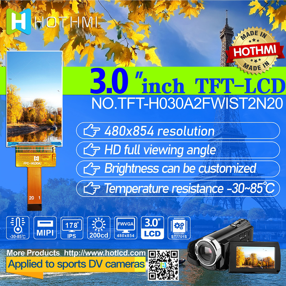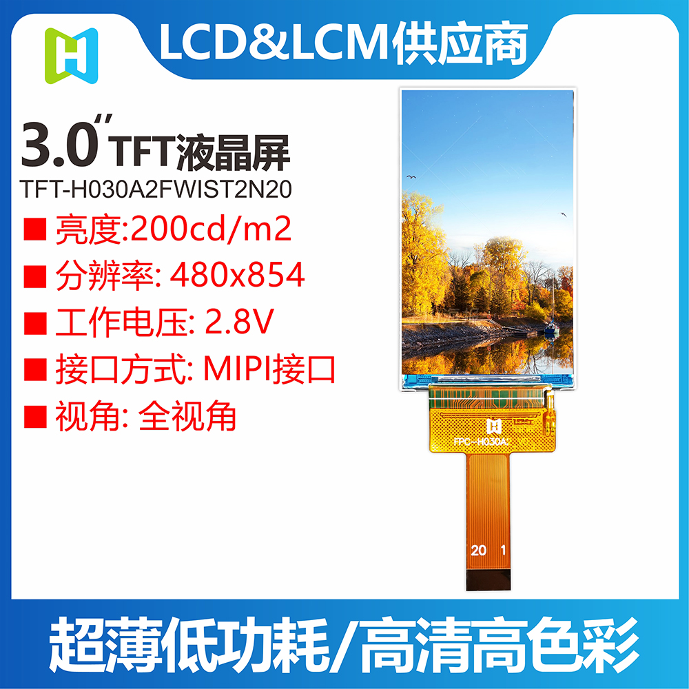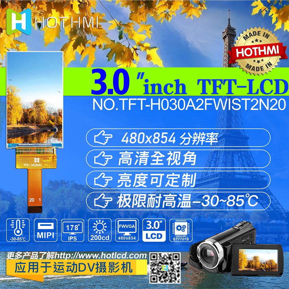 TFT-H030A2FWIST2N20是鑫洪泰HOTLCD于2021年3季度推出的一款3.0寸高清TFT顯示屏,分辨率高達480*854,也是目前3寸TFT分辨率最高的一款,H030A2采用IPS寬視角工藝,MIPI接口,非常適合一些運動(dòng)DV攝像機等高端智能產(chǎn)品選用。