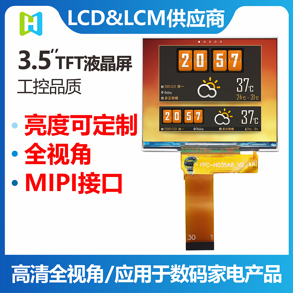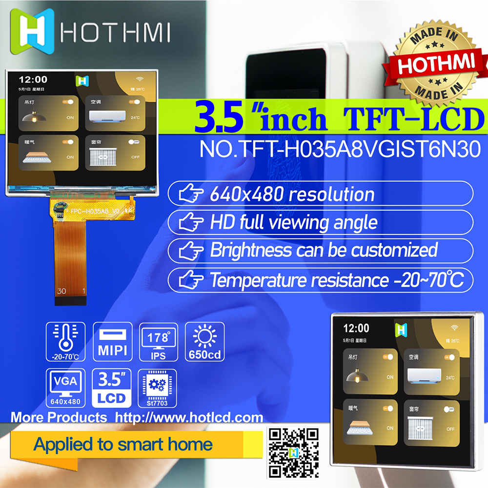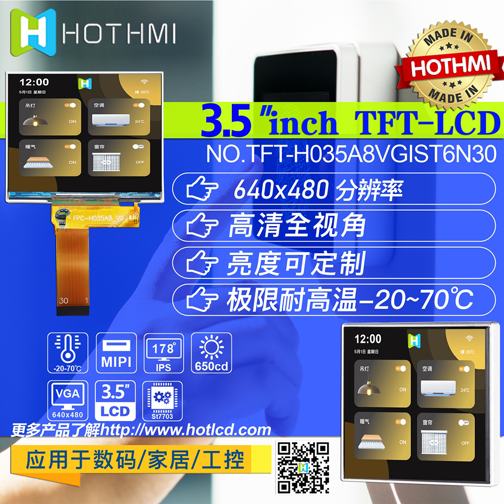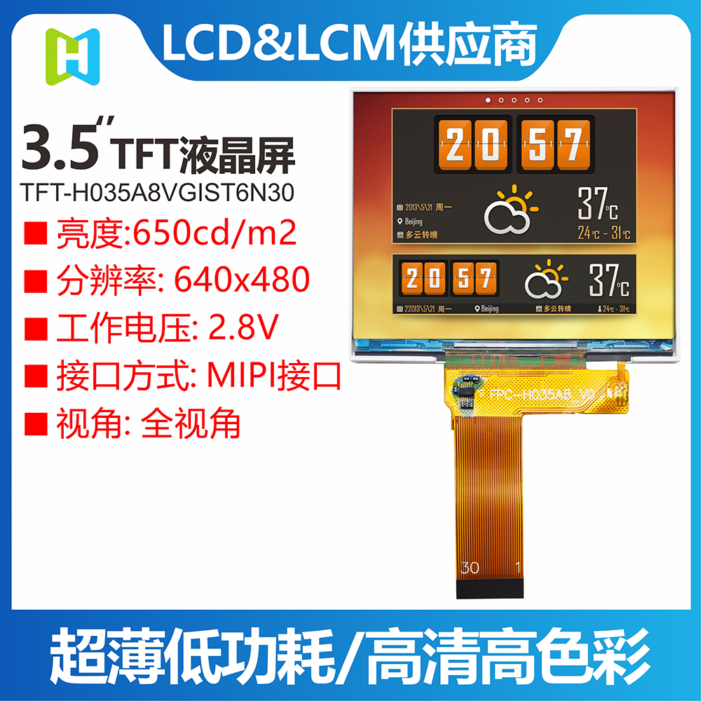產(chǎn)品說(shuō)明 TFT-H035A8VGIST6N30 是一款 3.5 英寸全彩 TFT LCD 模塊,分辨率為 640x480 像素,縱橫比為 1.25:1。 TFT模塊采用ST7703驅動(dòng)IC,支持MIPI接口。 采用IPS面板的TFT模組具有廣視角優(yōu)勢(左80度/右80度/上80度/下80度),典型對比度800:1,模組亮度高達650尼特 (典型值)。 模塊工作溫度范圍-20℃~+70℃,儲存溫度范圍-30℃~+80℃。