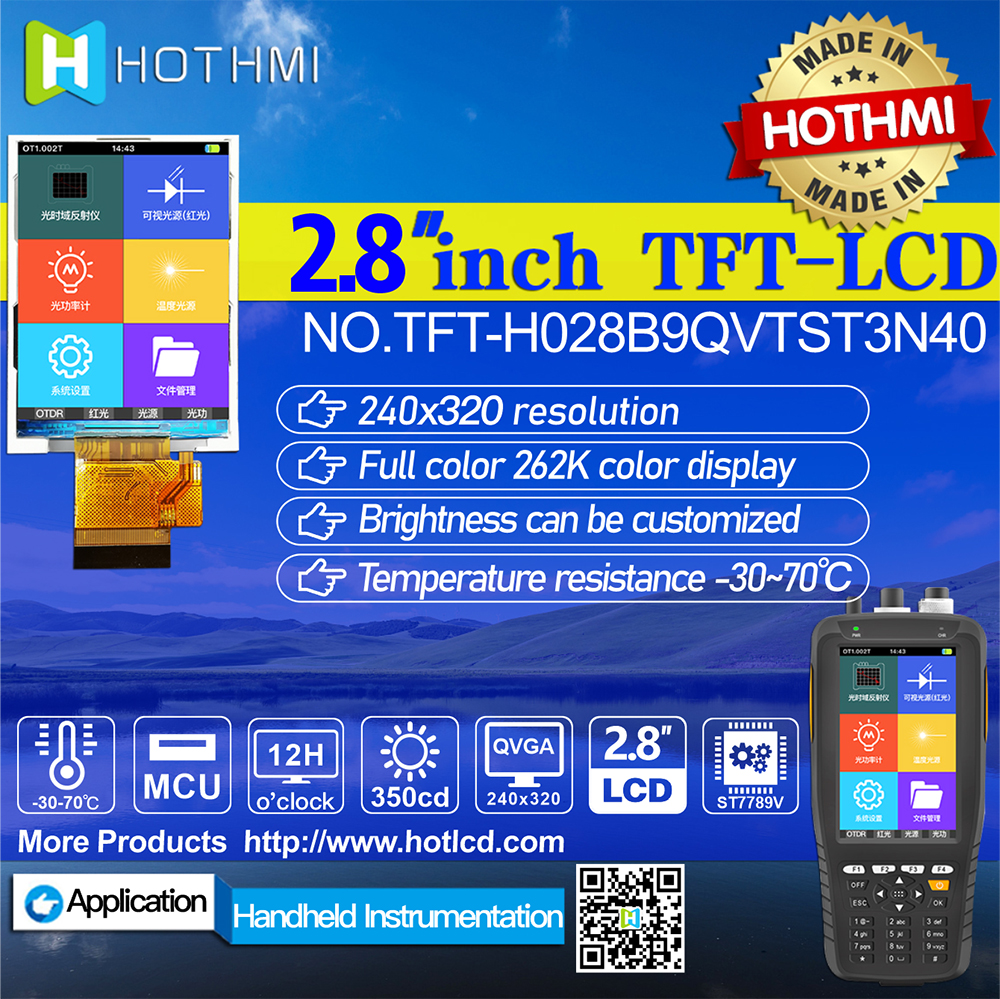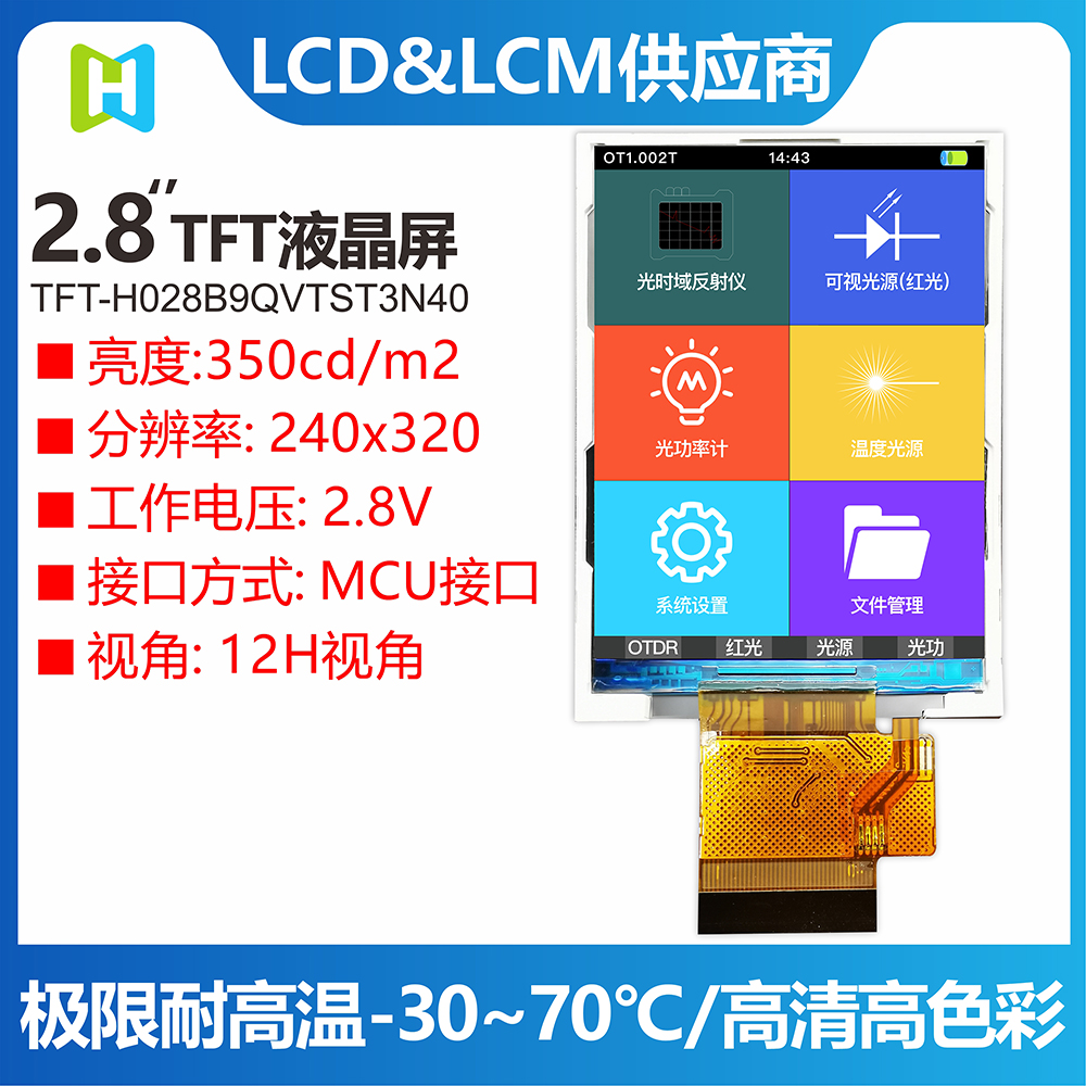 TFT-H028B9QVTST3N40是HOTLCD研發(fā)團隊精心設計的2.8英寸TFT彩色液晶屏,240*320分辨率,高畫(huà)質(zhì),廣視角,65K/262K真彩色,內置ST7789V控制器,支持MCU接口,40PIN外掛FPC可以接主板(可選接頭),單電源DC 2.8V供電。 TFT 模塊可配備觸摸屏,所有材料均符合 RoHS 標準。 廣泛應用于各種儀表、智能設備、分析儀器、手持儀表、行車(chē)記錄儀等:8051、PIC、AVR、ARDUINO、ARM、樹(shù)莓派等。