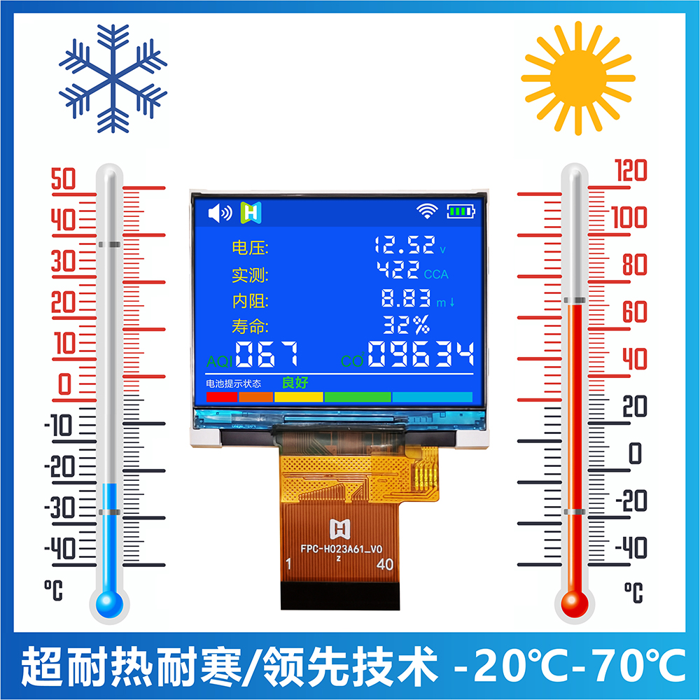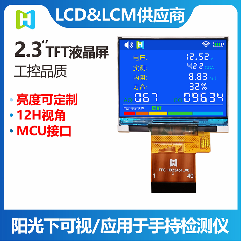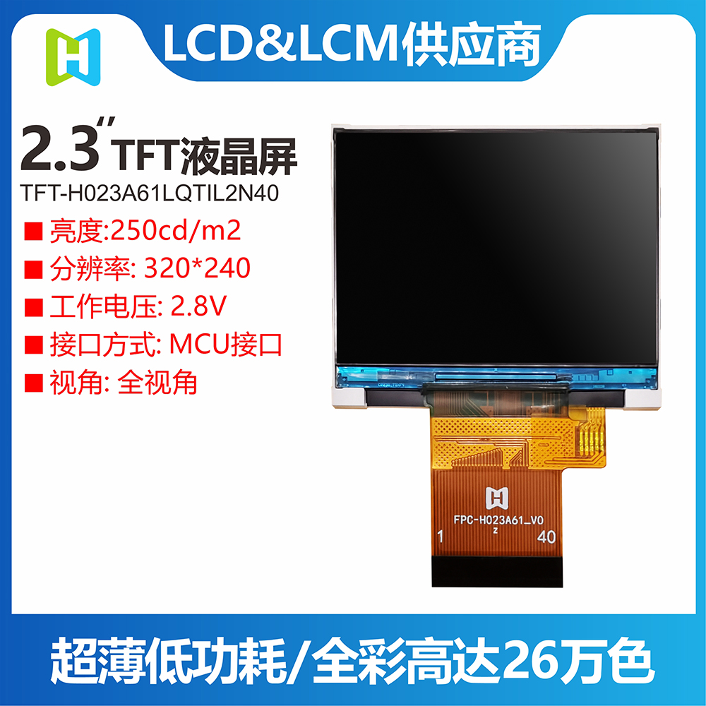 TFT-H023A61LQTIL2N40是一款工業(yè)級橫屏顯示的 TFT LCD液晶屏,分辨率為320*240像素,液晶屏typical 亮度為400 nits,視角為12H方向;供電電壓(VCI)為2.8V~3.2V,typical 值為2.8V。工作溫度為-20℃~+70℃,儲存溫度為-30℃~+80℃。產(chǎn)品使用于各項小型智能設備,家電,監控器等。