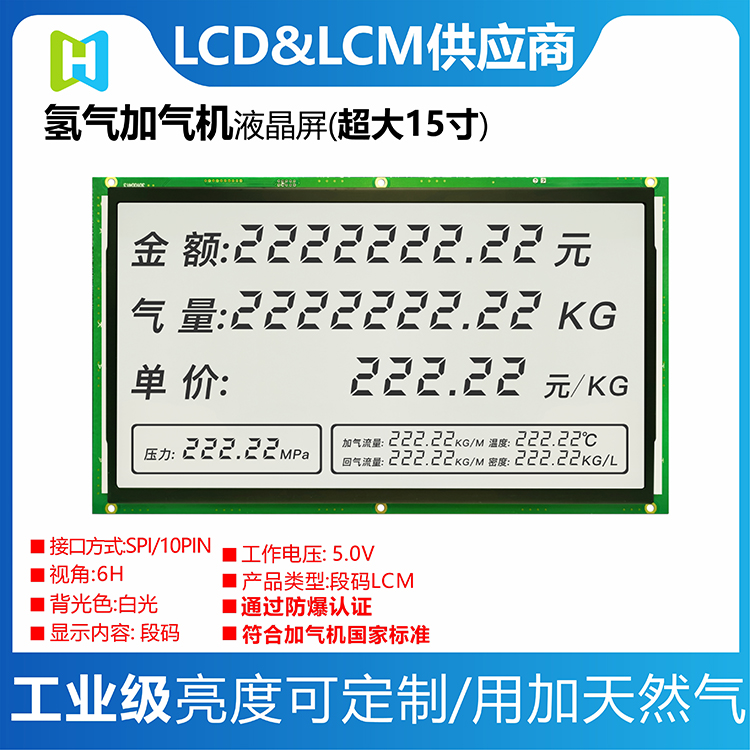 鑫洪泰HOTLCD專(zhuān)為加氣機研發(fā)了一款15寸大型段碼液晶顯示屏,這款屏不僅可以通過(guò)防爆認證還可根據客戶(hù)需求定制任意結構尺寸以及顯示內容