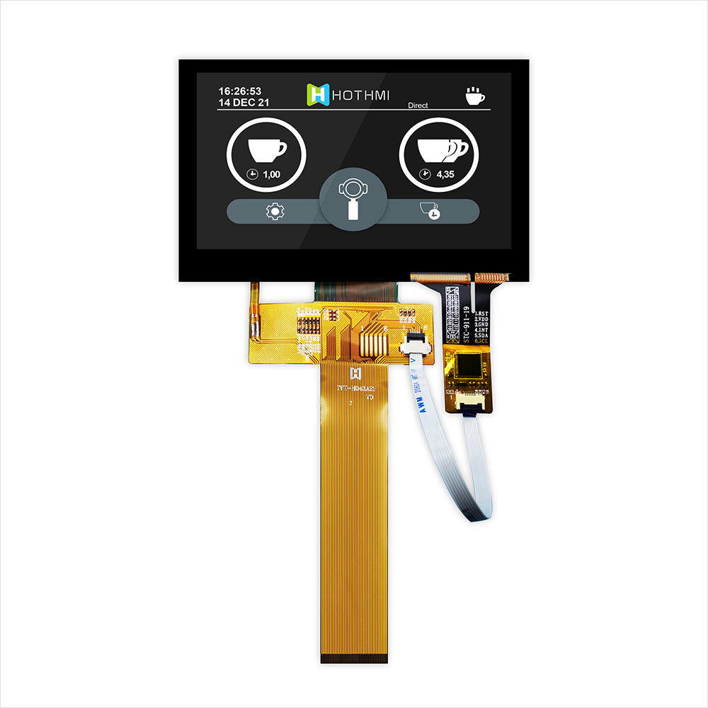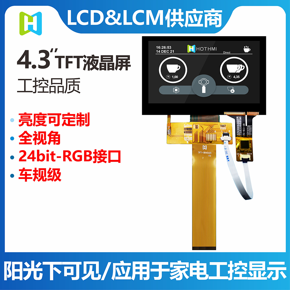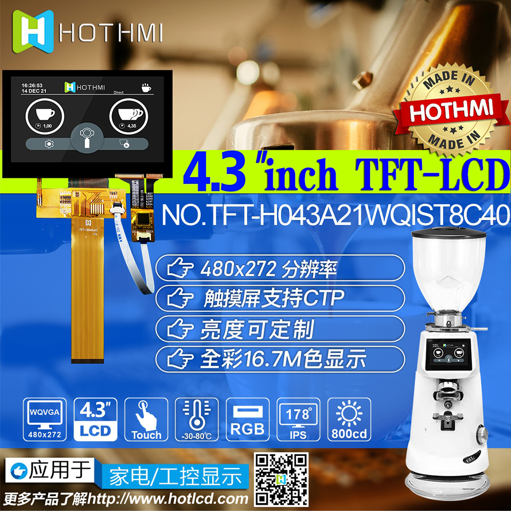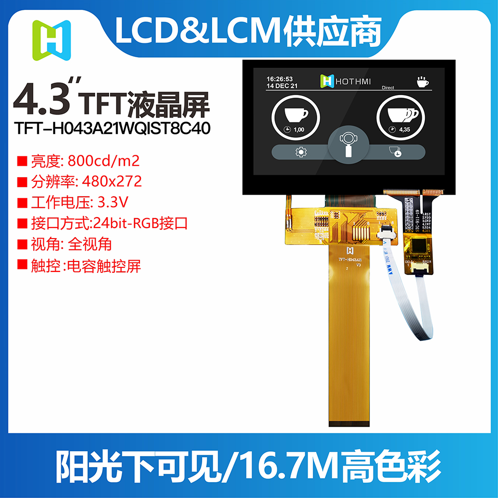 4.3寸TFT彩屏 /480*272分辨率 /全視角IPS工藝 /RGB 24Bit/IIC接口 /TFT-H043A21WQIST8C40/應用于咖啡機,家電,工控,醫療顯示設備,陽(yáng)光下可見(jiàn)
