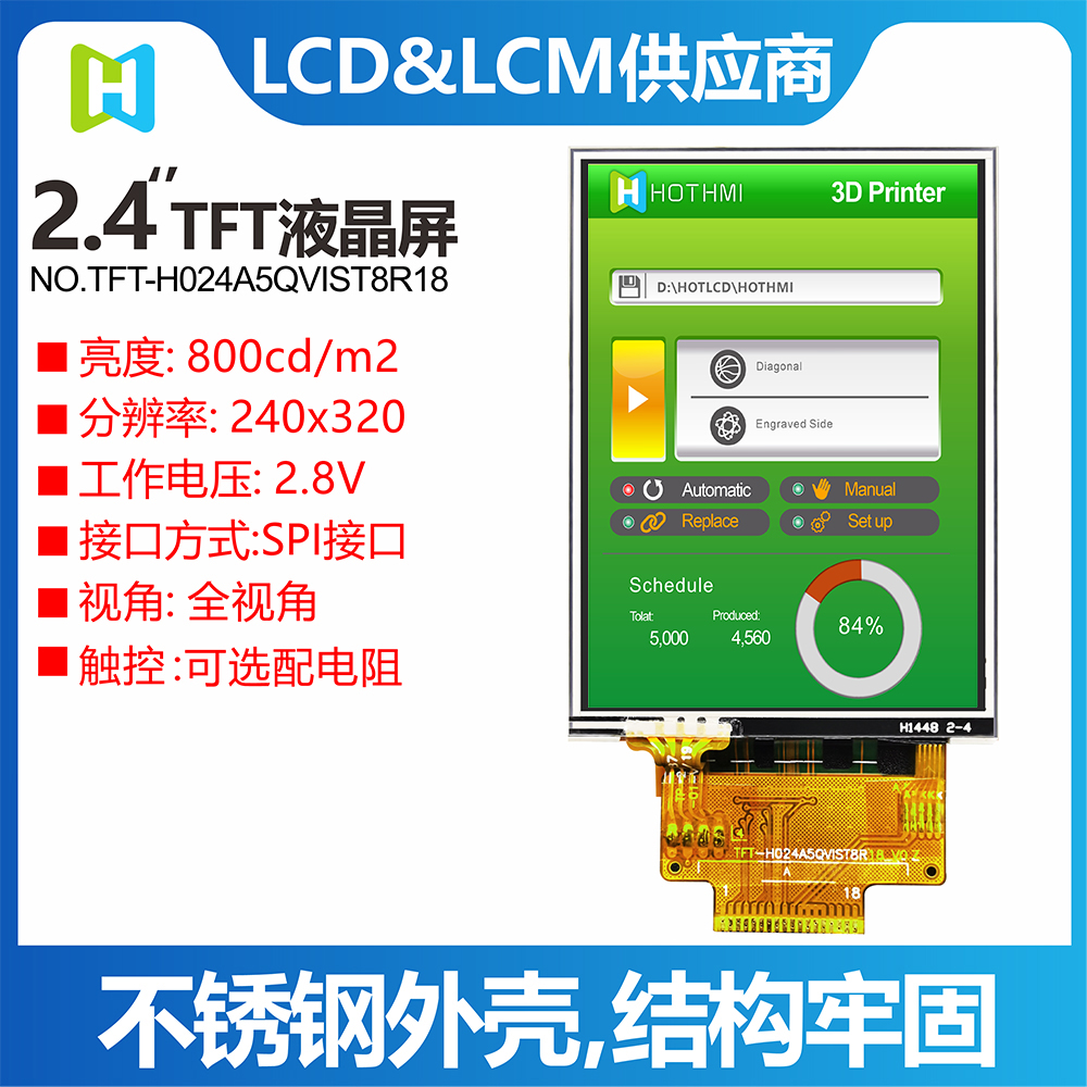 TFT-H024A5QVIST8R18是一款工業(yè)級豎屏顯示的 TFT LCD液晶屏,分辨率為240x320像素。使用ST7789V驅動(dòng)IC,自帶RTP電阻觸控屏??芍С諷PI-4L位兼容 SPI接口。液晶屏typical 亮度為800 nits,視角為全視角方向;供電電壓(VCI)為2.8V~3.3V,typical 值為2.8V。工作溫度為-20℃~+70℃,儲存溫度為-30℃~+80℃。