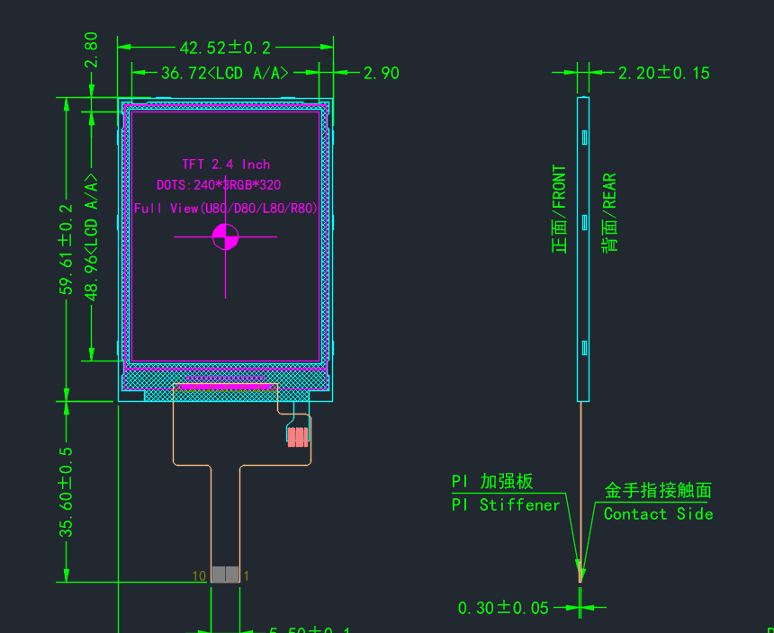 TFT-H024A16QVIST6N10是一款人像模式的微型TFT顯示屏,如果您想用觸控屏,請聯(lián)系我們以獲得更多技術(shù)支持。 這款 240x320 TFT LCD 亮度為 600 cd/m2(典型值),可在 -30℃ 至 80℃ 的溫度下工作; 其儲存溫度范圍為-30℃至80℃。