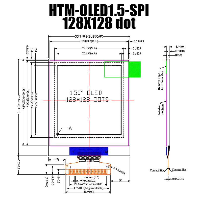 該顯示模塊的分辨率為 128x128 點(diǎn),可提供令人難以置信的清晰度和細節。 A.A 區域尺寸為 26.855x26.855mm,提供充足的空間來(lái)展示您的內容。 其 33.9x37.3mm 的緊湊尺寸使其非常適合空間受限的應用。
